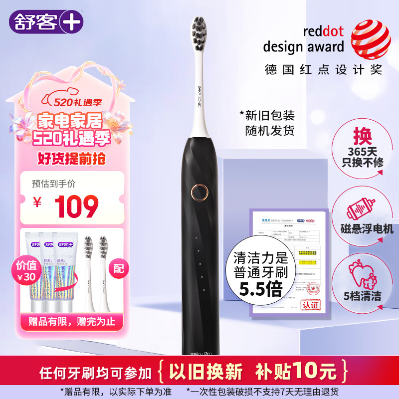 舒客舒克情侣电动牙刷智能换区清洁美白成人学生牙刷电动送男友/女友 5种模式电量提醒情人节礼物 T2黑价格:149.00元!