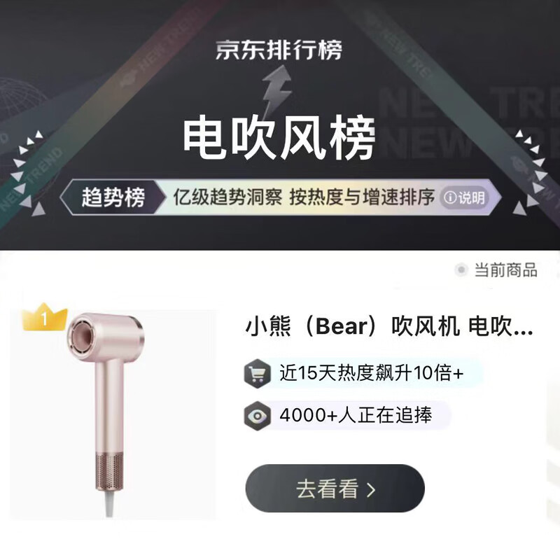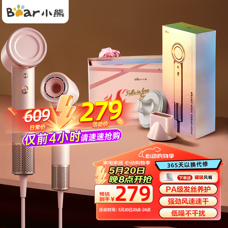 小熊(Bear)吹风机 电吹风家用 吹风筒大功率高速 低噪音亿级负离子 情人节节日礼物 DCF-C15W5【粉】礼盒款价格:609.00元!