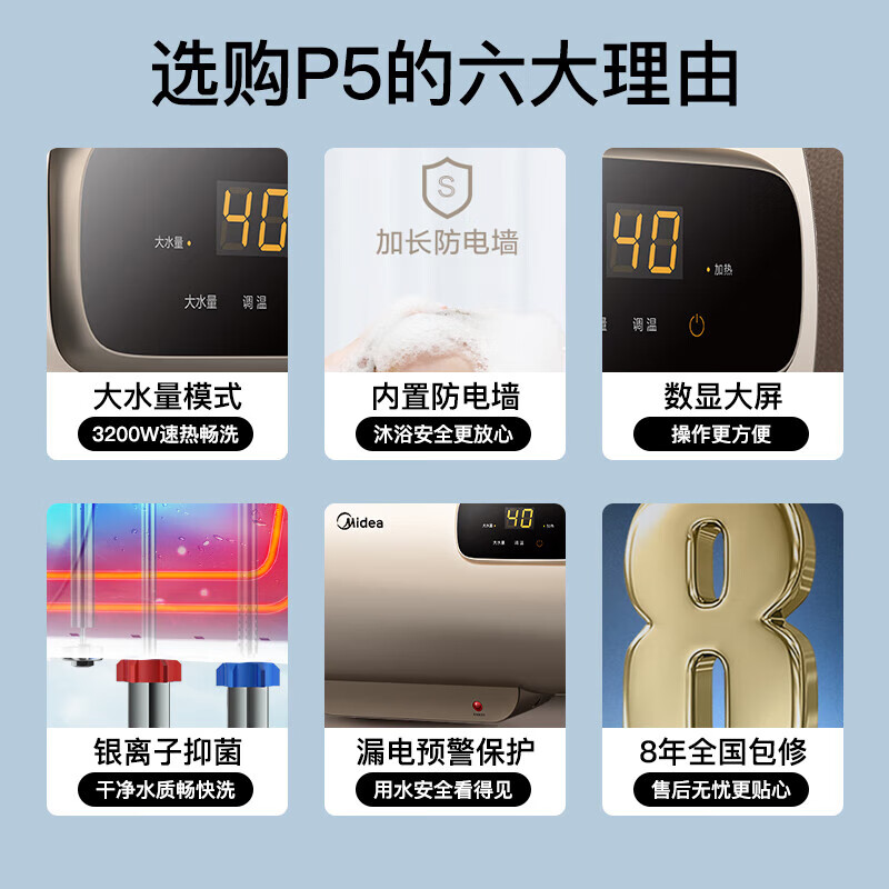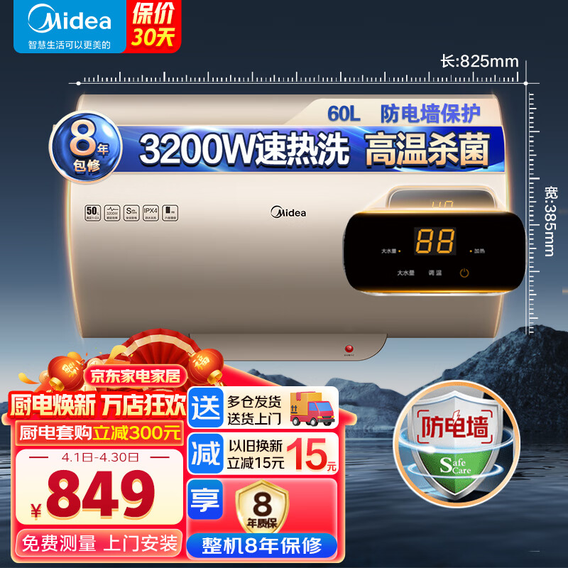 美的(Midea)60升电热水器家用数显3200W储水式速热恒温洗澡防电墙租房卫生间沐浴上门安装F6032-P5(H)价格:848.00元!