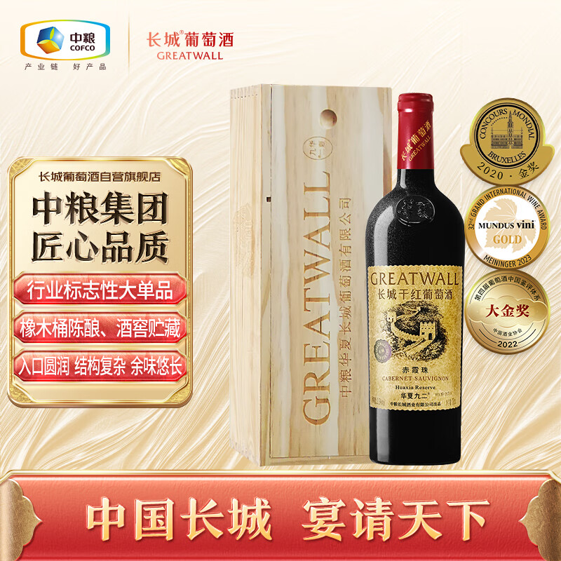 长城 华夏九二 珍藏级赤霞珠干红葡萄酒 750ml 木盒单瓶装价格:298.00元!
