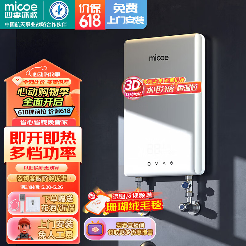 四季沐歌(MICOE)电热水器即热式 家用洗澡淋浴恒温免储水扁桶超薄过水热变频智能机 上门安装 DSK-H70-MS01【7000W变频】价格:586.00元!
