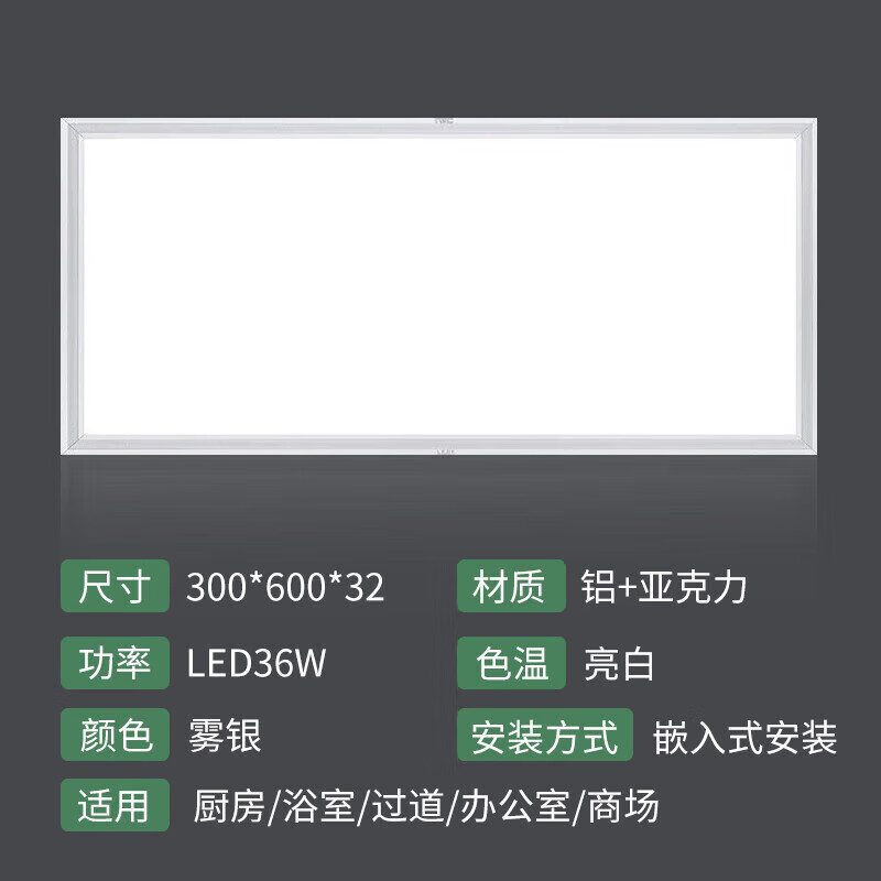 雷士照明(NVC)led集成吊顶灯铝扣板卫生间平板灯嵌入面板灯雾银36W白光 300*600价格:109.00元!