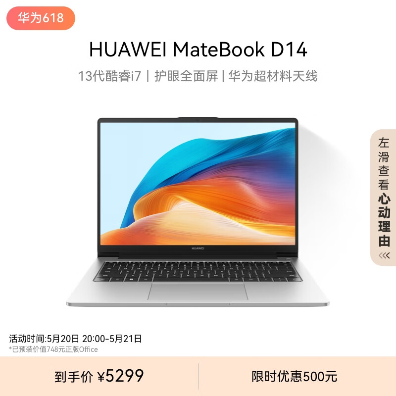 华为MateBook D 14 2023笔记本电脑 13代酷睿/14英寸护眼屏/轻薄办公本/超级终端 i7 16G IT 皓月银价格:5299.00元!