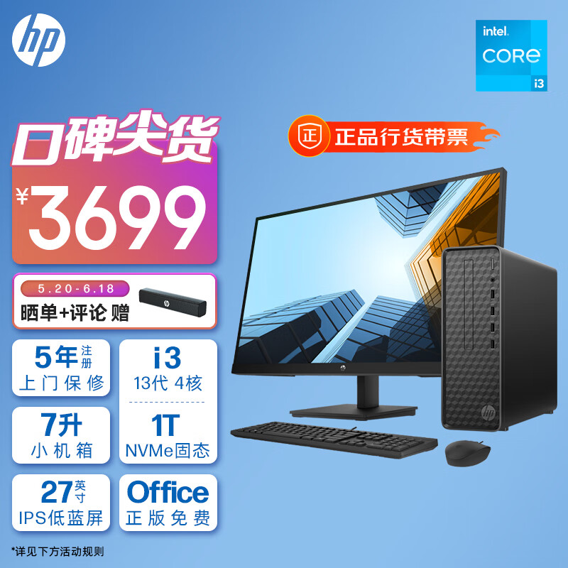 惠普HP 星Box商务办公台式电脑主机(13代酷睿i3-13100 16G 1TB固态硬盘 WiFi 注册五年上门)+27英寸价格:3399.00元!