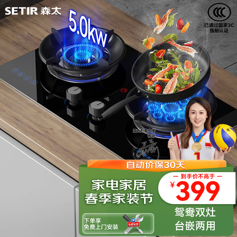 森太(SETIR)家用燃气灶液化气灶双灶台嵌两用 5.0kW大火力九腔猛火灶鸳鸯双灶 JZY-TA21 液化气灶价格:399.00元!