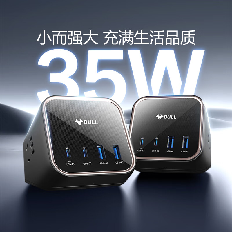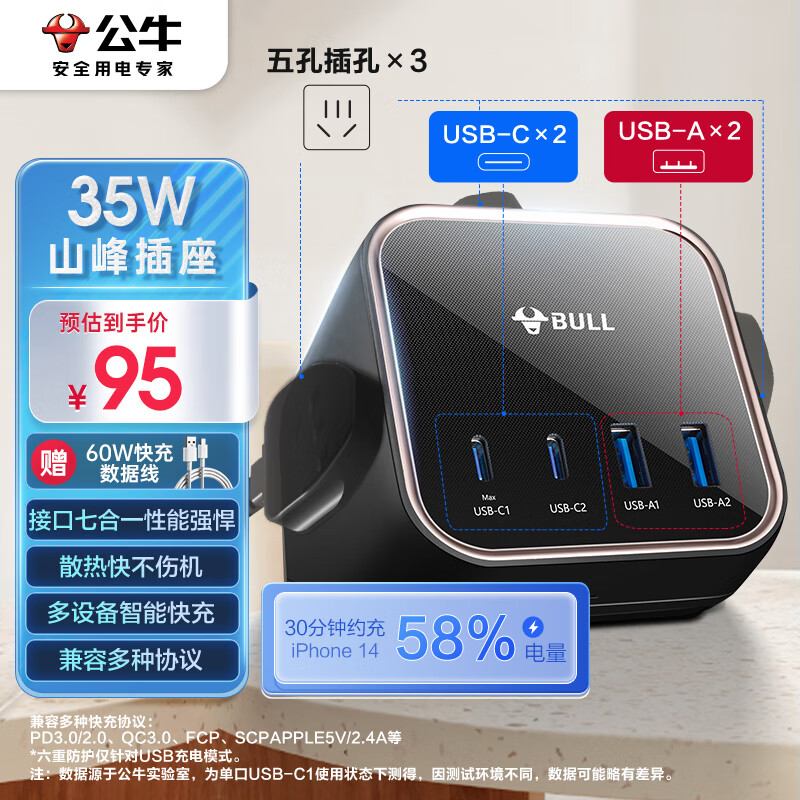 公牛(BULL)35W PD苹果快充插座/插线板/插排/接线板 USB(2C2A)+3插孔 全长1.5米 总输出35W GNV-MS1353价格:95.00元!
