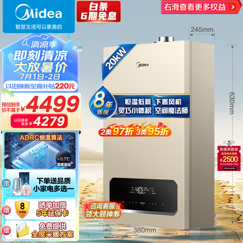 美的(Midea)双变频一级低噪舒适恒温燃气壁挂炉 天然气供暖 地暖 家用锅炉省气 以旧换新 下置风机L1GB20-R05价格:5699.00元!