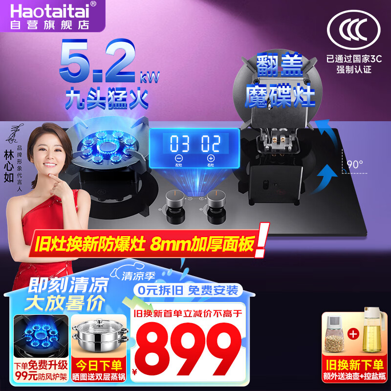 Haotaitai 家庭好用燃气灶具5.2KW智能定时魔碟双九腔猛火太太燃气灶台嵌入式可翻盖炉头燃气灶M2-S 天然气价格:1099.00元!