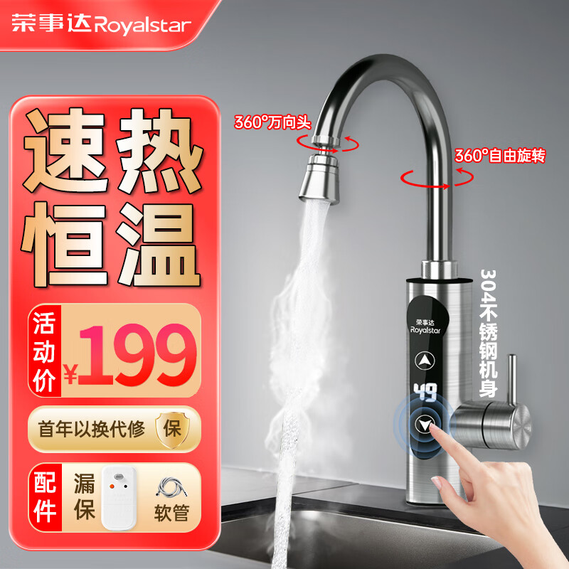 荣事达电热水龙头恒温不锈钢机身即热快速加热家用厨房过水热热水器水龙头RB03Y-34不锈钢漏保(恒温款)价格:239.00元!