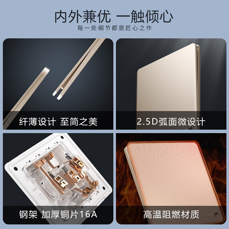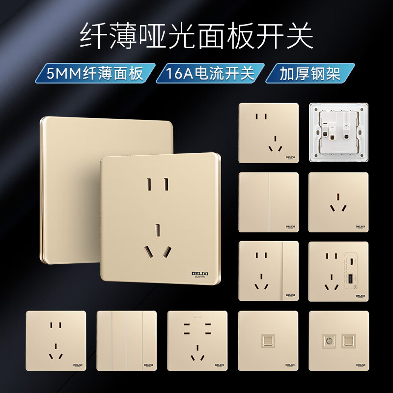 德力西(DELIXI)开关插座面板哑光290超薄墙开 无框大板86型暗装电源面板流沙金 Type-c+USB五孔插座价格:159.90元!