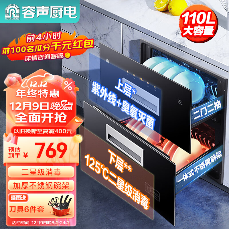 容声(RONGSHENG)二层二星 消毒柜 嵌入式 家用 消毒碗柜 高温 臭氧 厨房碗筷消毒柜 110L大容量RX02F(A)价格:769.00元!