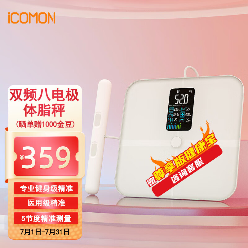 沃莱(ICOMON)体脂秤高精准八电极智能体重秤可充电健身房专用电子秤自有APP人体健康数据监测体脂仪价格:359.00元!