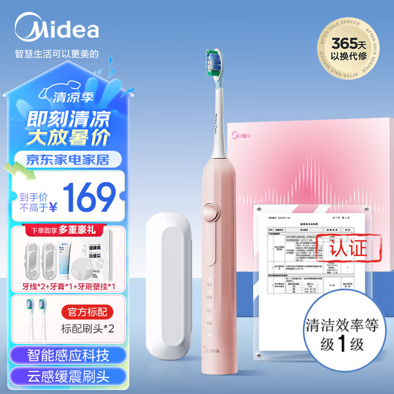 美的(Midea)电动牙刷成人情侣款送礼推荐 声波震动礼盒智能压感 软毛 (配云感刷头+旅行盒)YS5Pro粉价格:169.00元!