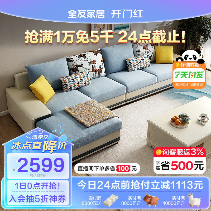 全友家居 现代简约家用大户型贵妃转角沙发客厅实木架布艺沙发102085价格:3712.86元!