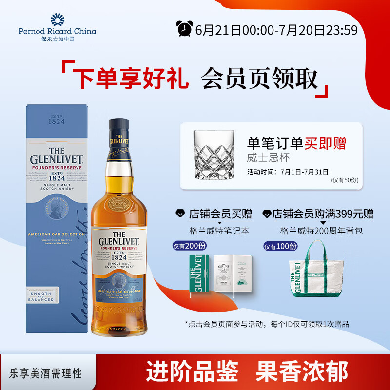 格兰威特(ThE GLENLIVET)创始人 苏格兰 单一麦芽 威士忌 洋酒 700ml 甄选系列价格:228.00元!
