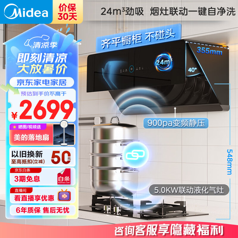 美的(Midea)抽油烟机灶具套装 侧吸式24吸力挥手自清洁超薄烟机 5kW燃气灶烟灶联动JA5+Q523L液化气套装价格:2799.00元!