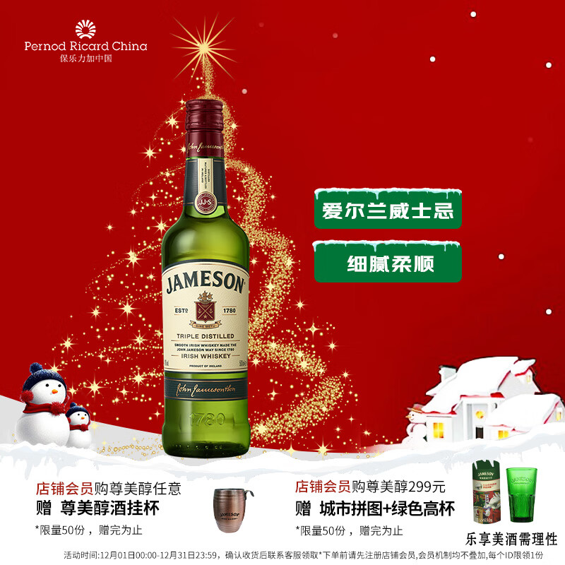 尊美醇(Jameson)爱尔兰 调和型 威士忌 洋酒 500ml 年货送礼价格:80.00元!