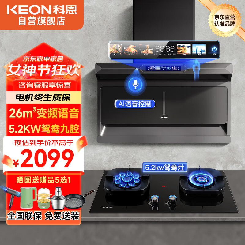 科恩(KEON COANDA)(KEON)科恩2件套抽油烟机智能语音猛火九头灶CXW-220-PY2-BX+JZT-JX1-JL价格:2449.00元!