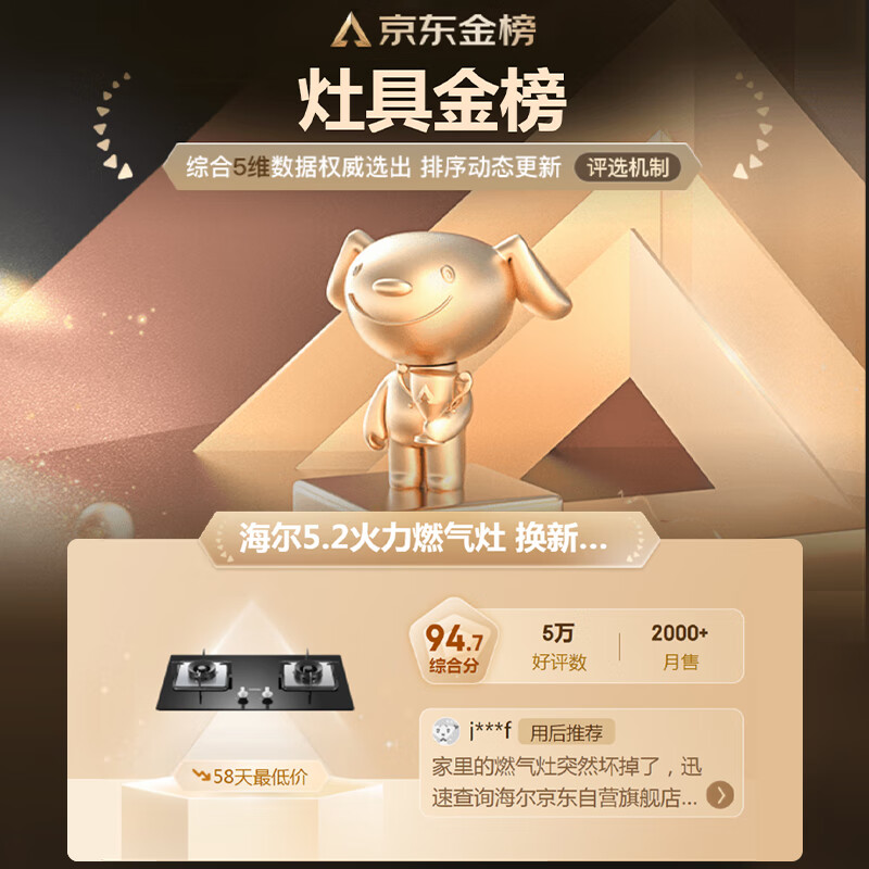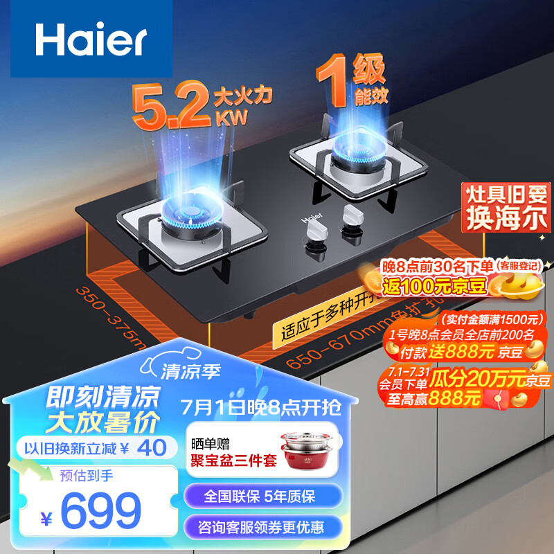 海尔(Haier)燃气灶天然气 家用嵌入式双灶5.2kw猛火 自动熄火保护 台嵌两用一级能效 可调节底壳Q2BE3(天)价格:699.00元!