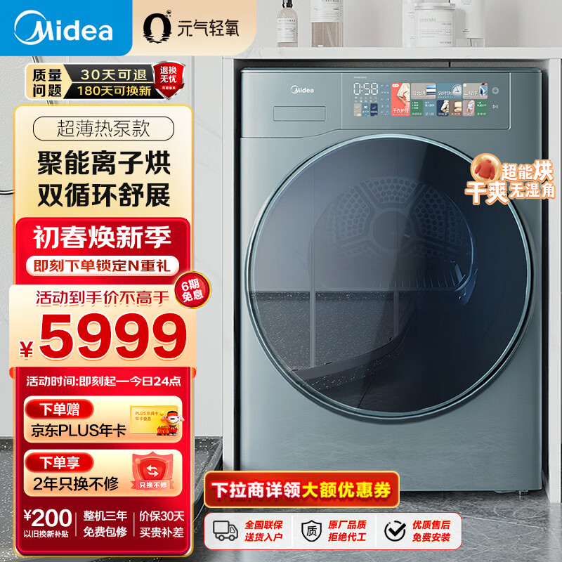 美的(Midea)烘干机 家用热泵式干衣机 10公斤 紫外线除菌 除螨除潮 祛除宠物毛发 MH100IAIR5价格:5999.00元!