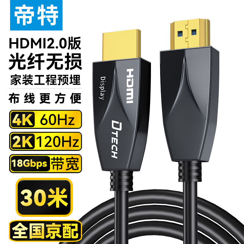 帝特光纤HDMI线2.0版4K60Hz工程装修线电脑办公机顶盒连接电视显示器投影仪家用3D发烧级高清线30米DT-HF2030价格:268.00元!