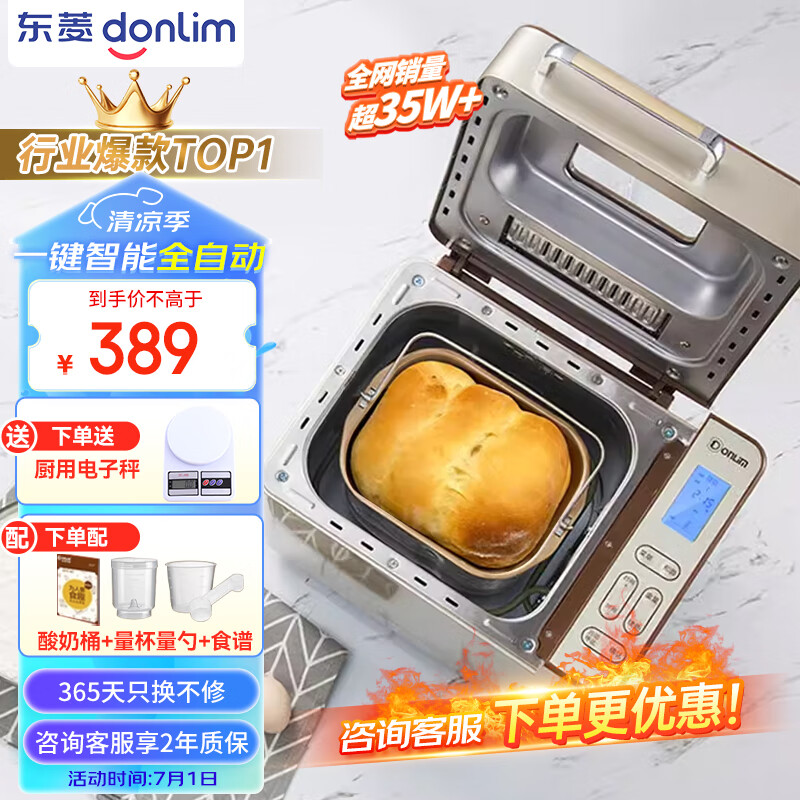 东菱Donlim 面包机 全自动 和面机 家用 揉面机 可预约智能投撒果料烤面包机DL-TM018价格:389.00元!