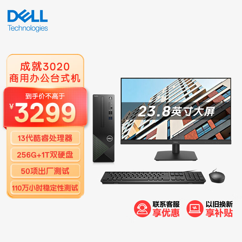戴尔(Dell)成就3020 台式电脑主机 高性能整机 (13代i3-13100 8G 256GSSD+1TB三年上门)23.8英寸大屏显示器价格:3299.00元!