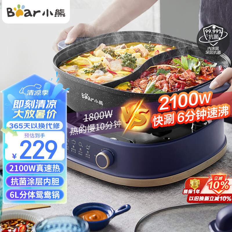 小熊(Bear)电火锅 电煮锅 鸳鸯锅 家用火锅专用锅电热锅 电锅分体式多功能锅涮肉锅火锅锅具 DHG-C60D1 6L价格:229.00元!