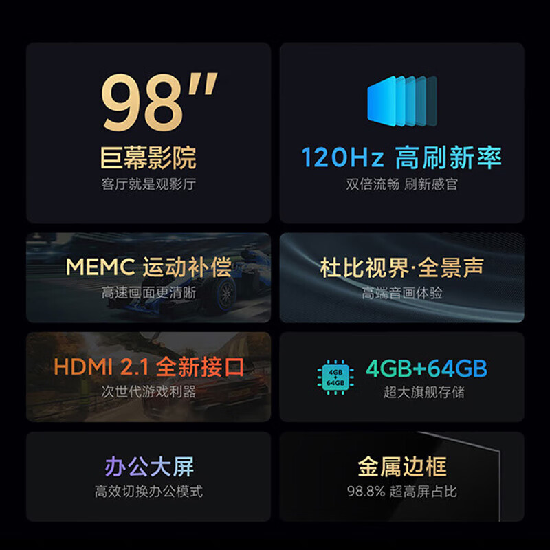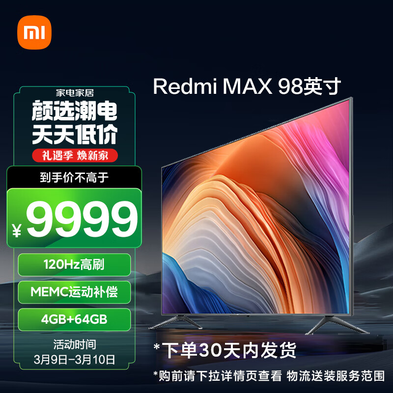 小米电视 Redmi MAX 98英寸超大屏 120Hz 4KHDR超高清 MEMC运动补偿 内置小爱 智能教育电视L98M6-RK价格:9999.00元!