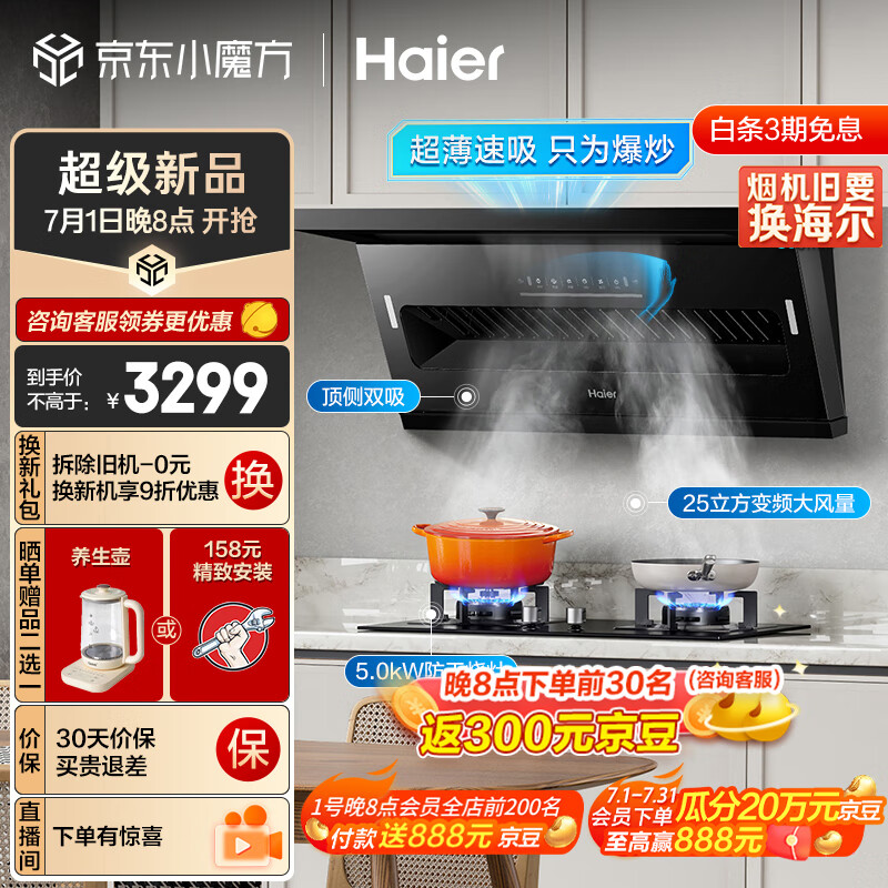 海尔(Haier)抽油烟机 顶侧双吸烟灶套装 变频25m3/min大吸力 5.0kw防干烧 家用油烟机燃气灶具套装C61+QE9B1天价格:3299.00元!