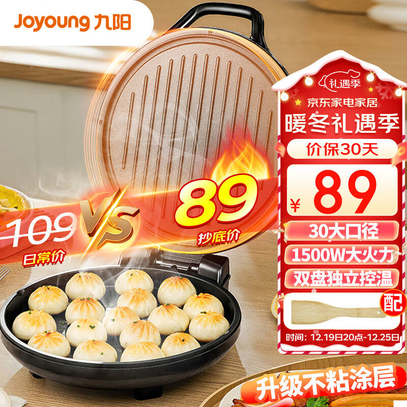 九阳(Joyoung)家用电饼铛 早餐机1500W大火力煎烤机烙饼机双面加热悬浮设计 JK-30K09价格:89.00元!