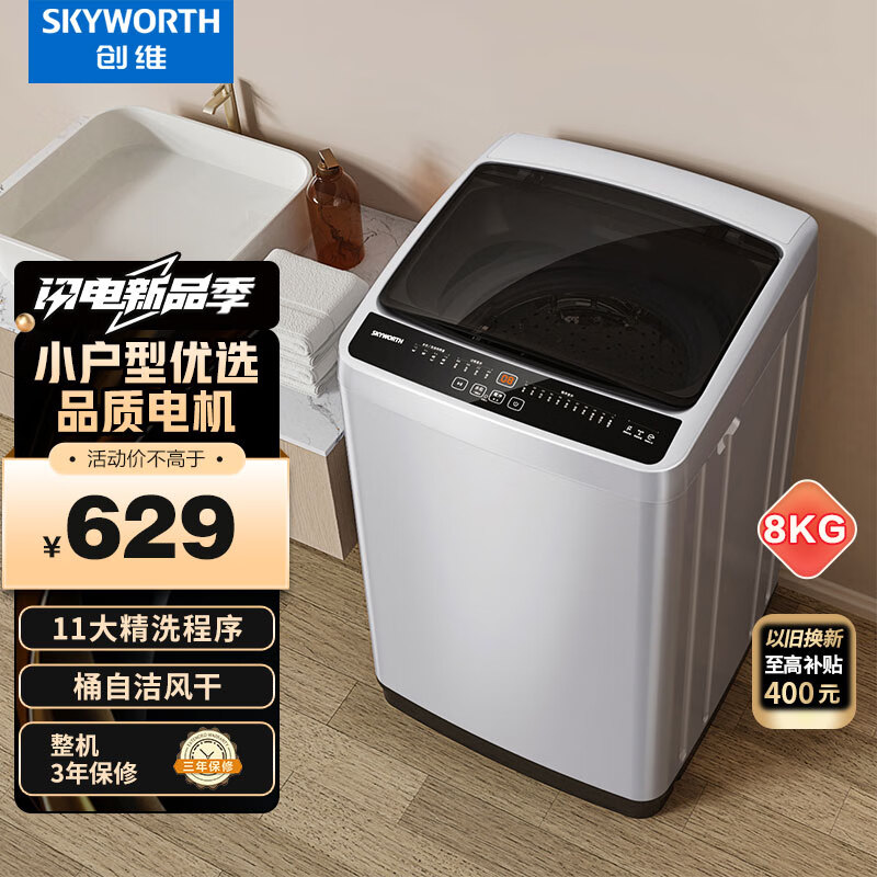 创维(SKYWORTH)8公斤洗衣机全自动波轮 家用宿舍租户洗衣机筒自洁脱水甩干 降噪省电价格:629.00元!