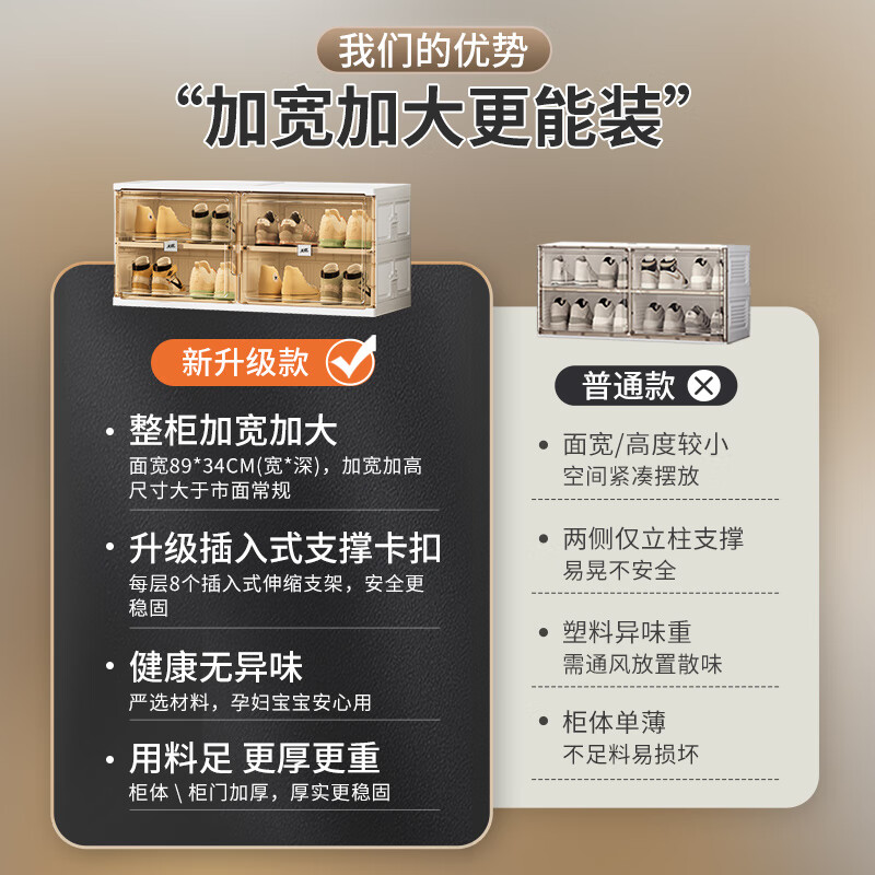 1、东西确实很不错,非常容易安装,不需要安装说明书轻轻松松装好,吸磁扣很方便,防尘又容易开关,整体颜值也很百搭,可以放大尺寸的鞋,家里鞋子收纳就靠它了
