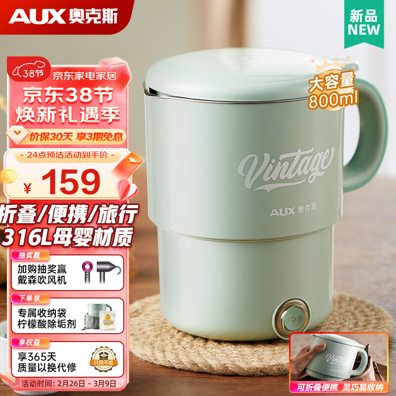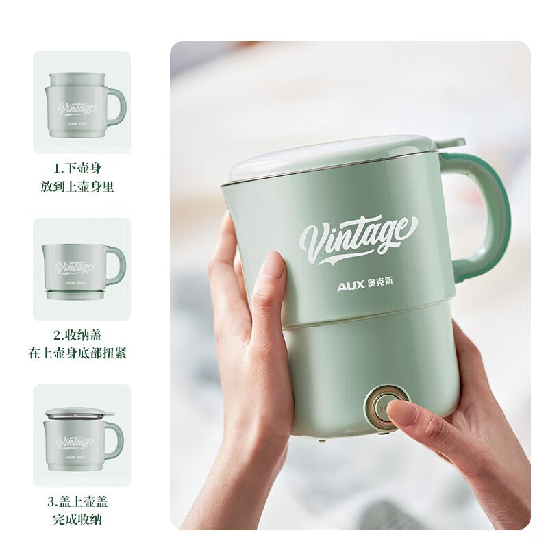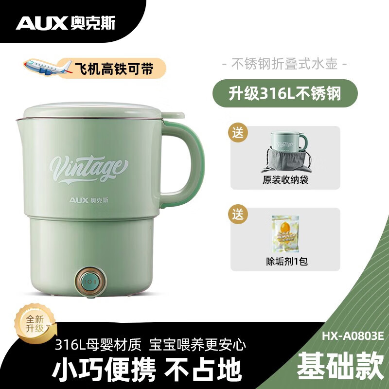 奥克斯(AUX)便携式烧水壶 316L不锈钢折叠水壶烧水旅行电水壶 家用烧水杯养生冲奶保温 HX-A0803E 迷雾绿(青春基础款) 0.8L价格:199.00元!