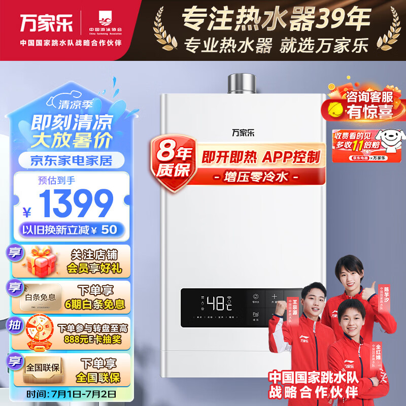 万家乐 13升燃气热水器增压零冷水天然气WIFI智控启停微波动恒温循环防冻JSQ26-13RL0【以旧换新】价格:1399.00元!