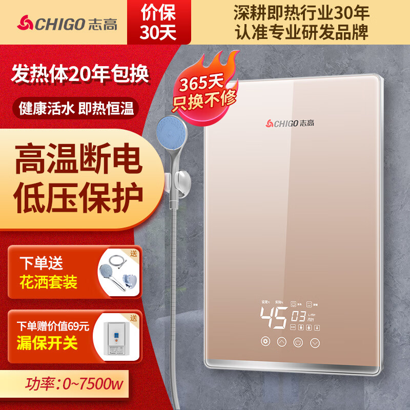志高(CHIGO)即热式电热水器7500W变频恒温速热小厨宝热水器省电家用集成淋浴洗澡免储水功率送漏保ZG-KB732价格:489.00元!