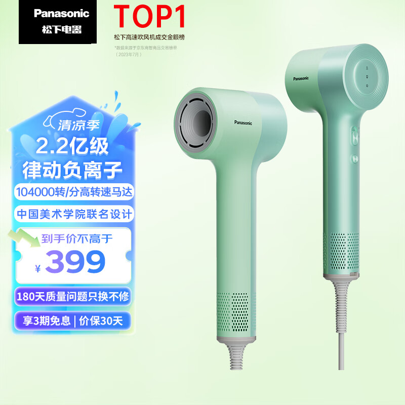 松下(Panasonic)缤纷筒高速吹风机负离子低噪音大风力家用送礼物电吹风速干护发家用大功率吹风筒NE7H莫奈绿价格:399.00元!