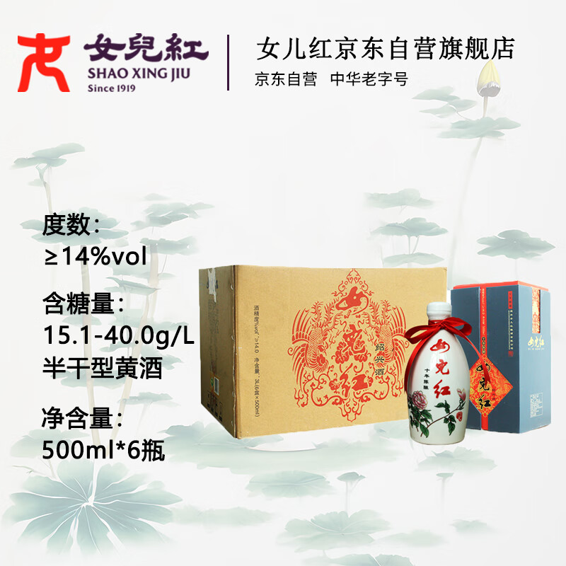 女兒红十年陈酿 牡丹瓶 半干型 绍兴花雕 500ml*6瓶 整箱装配置参数: