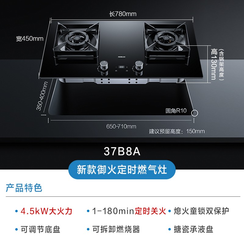 老板(Robam)御火大师37B8A家用4.5kW嵌入式钢化玻璃易打理可调节底盘燃气灶双灶 可定时灶具灶台(液化气)价格:1999.00元!