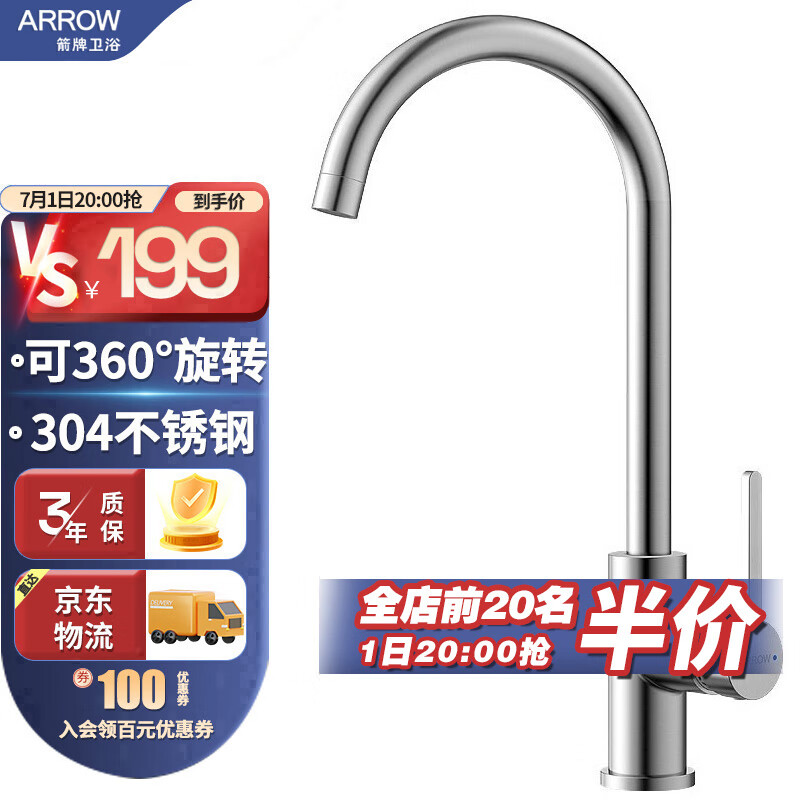 箭牌(ARROW)304不锈钢厨房水龙头 360度旋转冷热菜盆龙头AE45116MSS价格:229.00元!