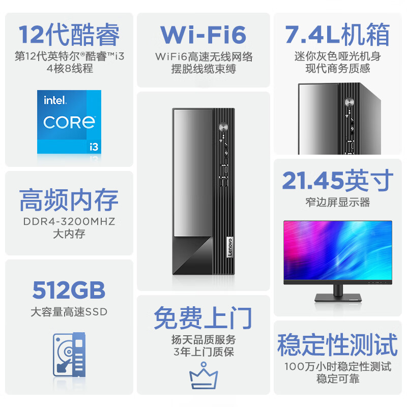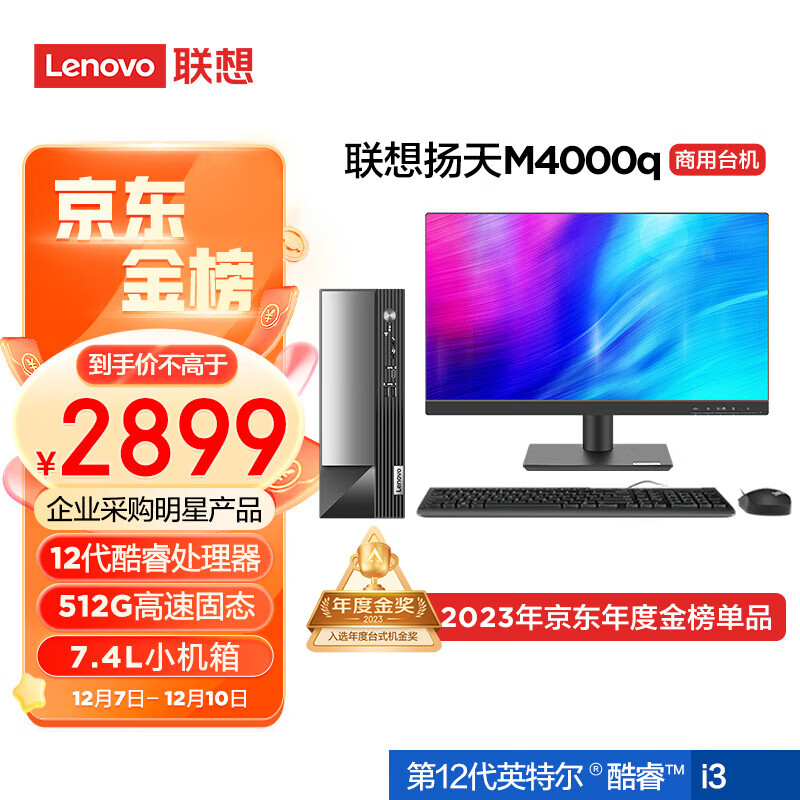 联想(Lenovo)扬天M4000q 英特尔酷睿i3 商用办公台式机电脑主机(12代i3-12100 8G 512G Win11)21.45英寸价格:2899.00元!
