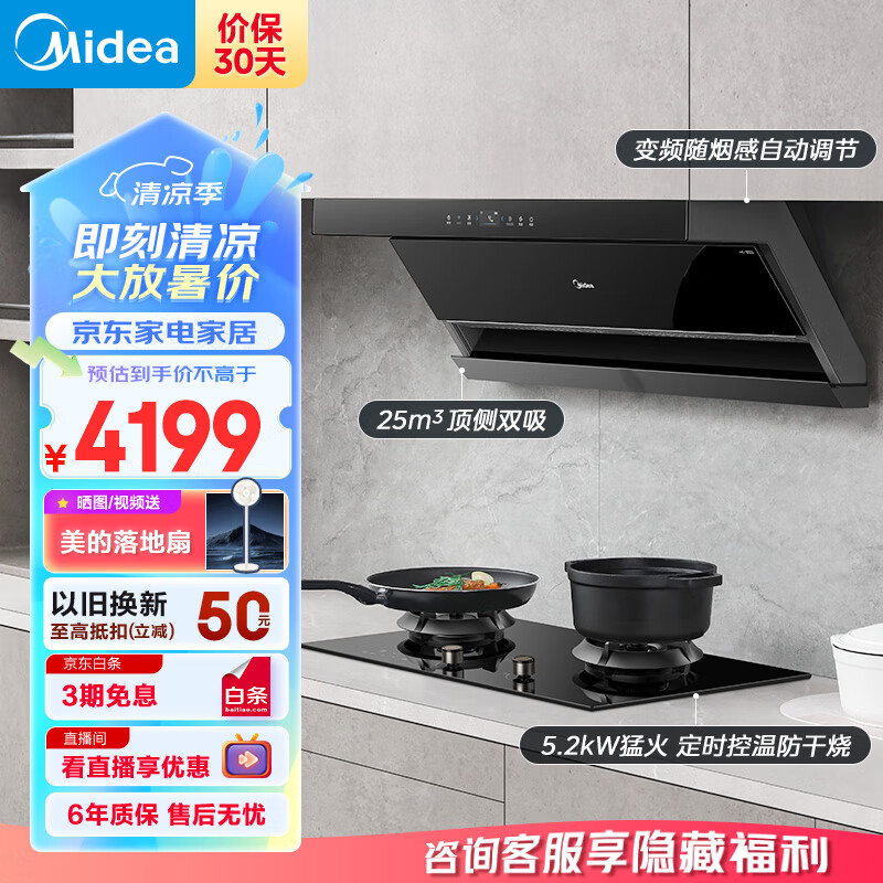 美的(Midea)抽油烟机防干烧燃气灶具家用顶侧双吸烟灶套装DL7+Q715K天然气价格:4299.00元!