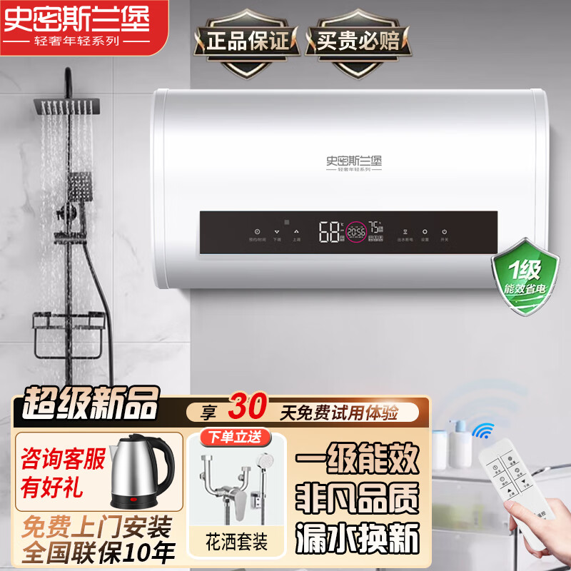 史密斯兰堡储水式电热水器家用 40升扁桶即开即热洗澡双胆双倍防护 2200W一级能效经济节能包安装DSZF-T06Y40价格:638.00元!