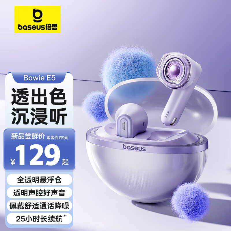 倍思E5 真无线蓝牙耳机 半入耳舒适佩戴 通话降噪长续航蓝牙5.3音乐透明风耳机适用苹果华为小米 紫价格:159.00元!