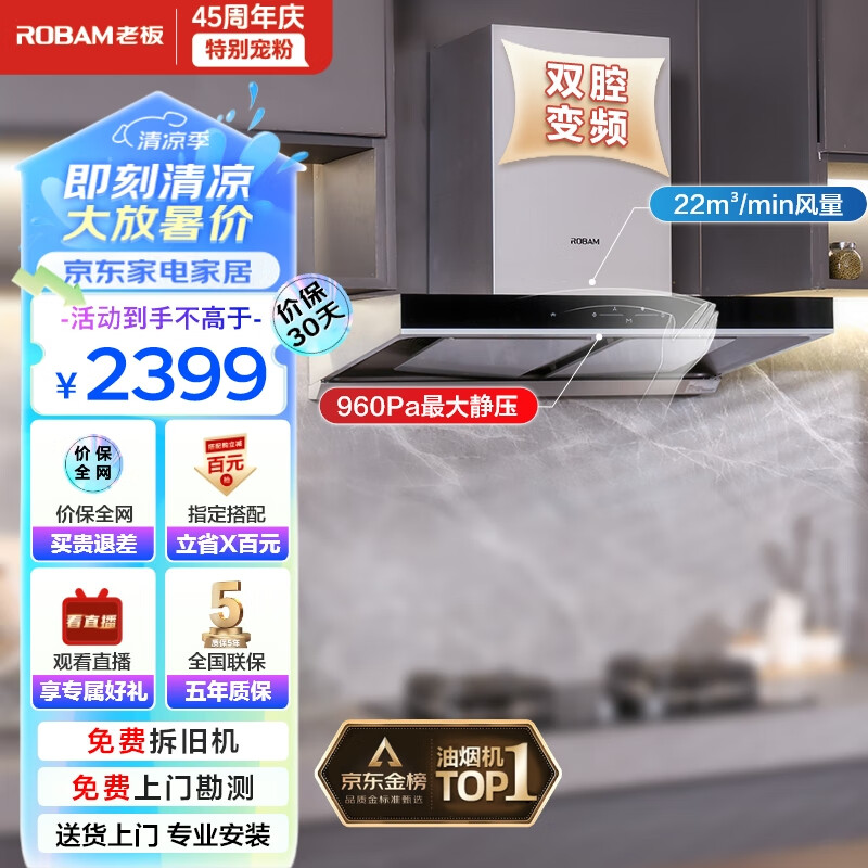 老板(Robam)抽油烟机家用大风量顶吸式 一级能效吸油烟机22风量双腔变频低噪 欧式脱排油烟机60D1S价格:2399.00元!