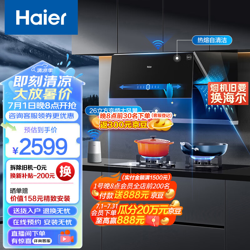 海尔(Haier)抽油烟机燃气灶 侧吸式变频烟灶套装 26立方大吸力 挥手智控 家用厨房抽烟机EC911UD+Q2BE2液价格:2599.00元!