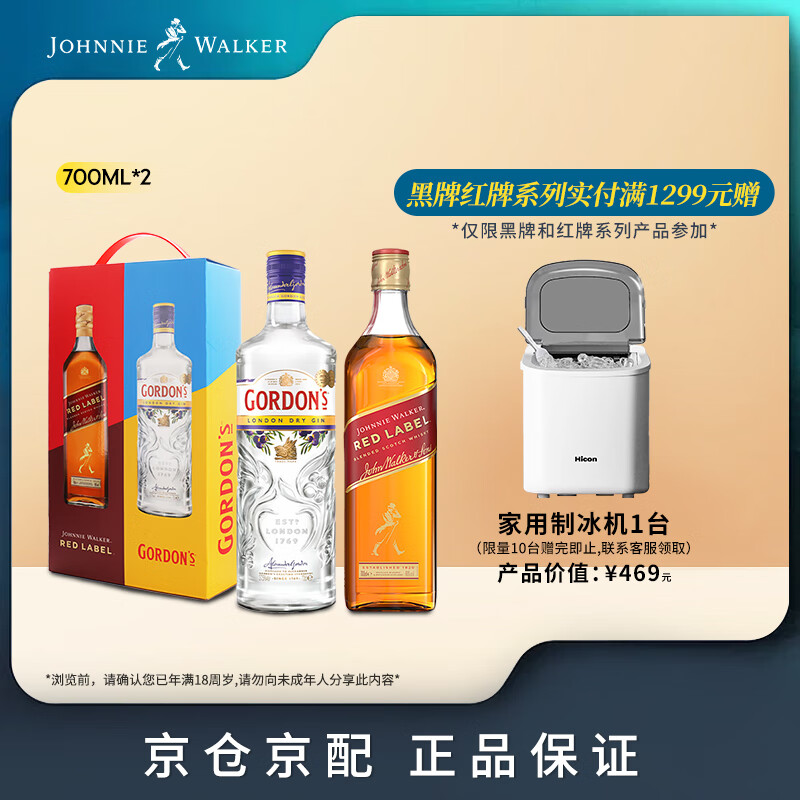 尊尼获加(JOHNNIE WALKER)洋酒 红牌红方 哥顿金酒 联合套装礼盒(700ml*2瓶)价格:182.00元!