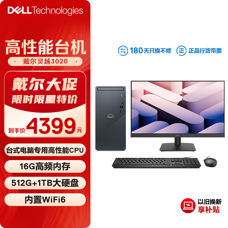戴尔(DELL)灵越3020 台式电脑主机 (酷睿13代i5-13400 16G 512GB+1TB)23.8英寸显示器价格:4399.00元!