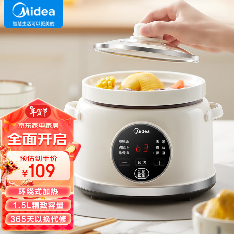 美的(Midea)电炖锅 电炖盅 煲汤锅炖汤锅 煮粥锅 陶釜内胆 1.5L 智能预约定时DG15Q2-412W价格:99.00元!