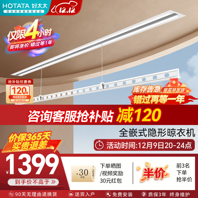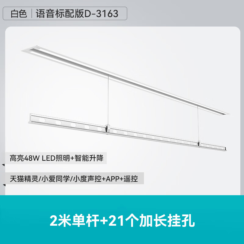 好太太(Hotata)电动智能晾衣架隐形嵌入式照明语音阳台升降晒衣服架 2米白色单杆价格:1599.00元!